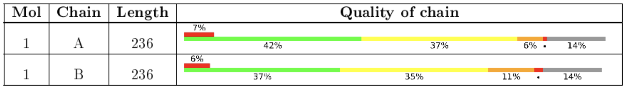 In this table each line is one chain (subunit) of the structure. It is important to realize that the parts of the structure shown in gray are amino acid residues that are present in the protein or nucleic acid sample but not present in the structure. Green indicates regions of high quality. Yellow, orange, and red indicate increasing numbers of outliers for one or more of the quality metrics in that region of the structure. The percentage of outliers in each region of the chain is indicated by the numbers under each colored bar.
