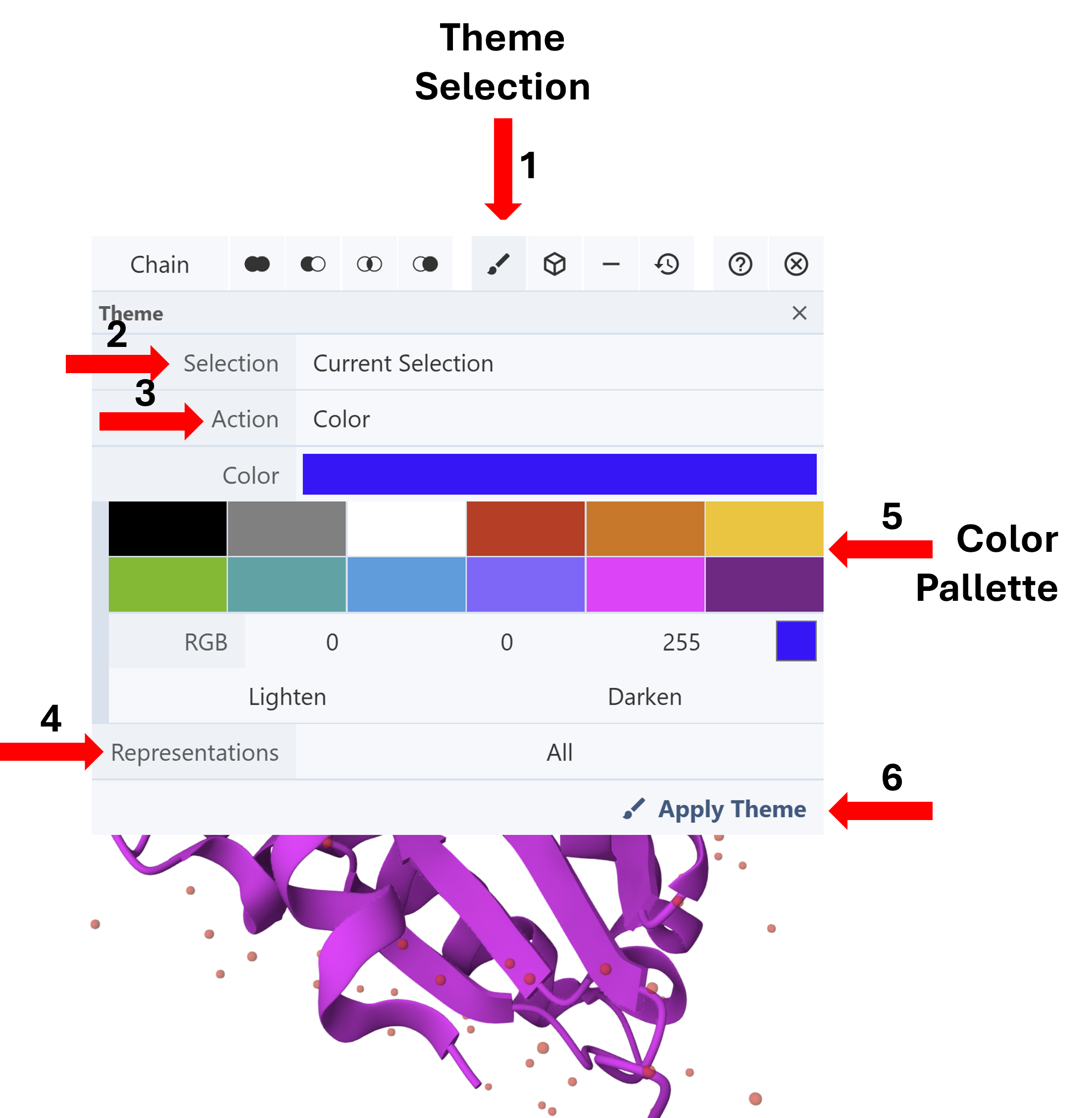 - Click the paint brush icon on the selection bar to open the “Theme” panel (Arrow 1). This panel allows for three independent controls, which can be activated by clicking on the cell showing the default choice. “Current Selection” is the default for theme selection (Arrow 2), “Color” is the default theme action (Arrow 3), and “All” is the default theme representation (Arrow 4). The color action is activated by default, giving direct access to the color palette (Arrow 5).