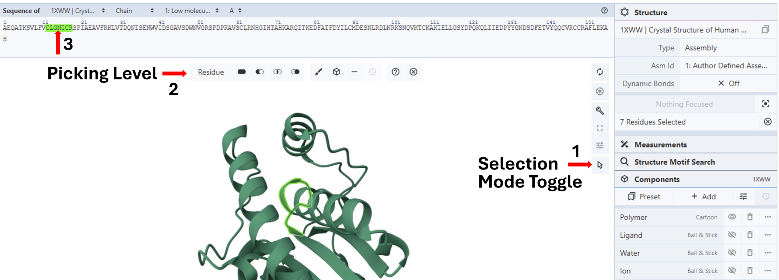 Note: Hovering your cursor on any part of the sequence or structure will display information about the PDB ID, model number, instance, chain ID, residue number, and chain name listed at your chosen picking level at the bottom right corner of the 3D canvas.