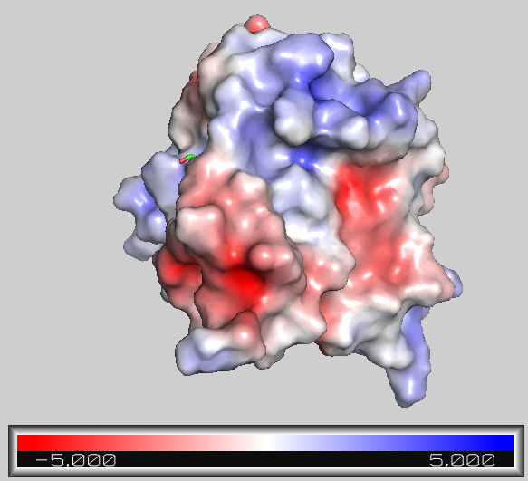 - APBS will calculate the coulombic potential and color the surface according to the calculated charge. Red = negative, white = neutral, blue = positive.