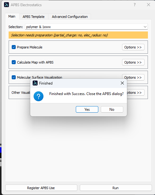 - In the pop-up box, click “Run”. A black pop-up will open and begin running calculations (this may require you to run PyMOL as administrator). A successful run will end with a small pop-up that says: “Finished with Success”.