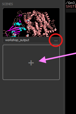 A computer screen displaying the scenes window with the “+” arrow to add a scene indicated by a magenta arrow and the “...” menu for renaming circled in red.